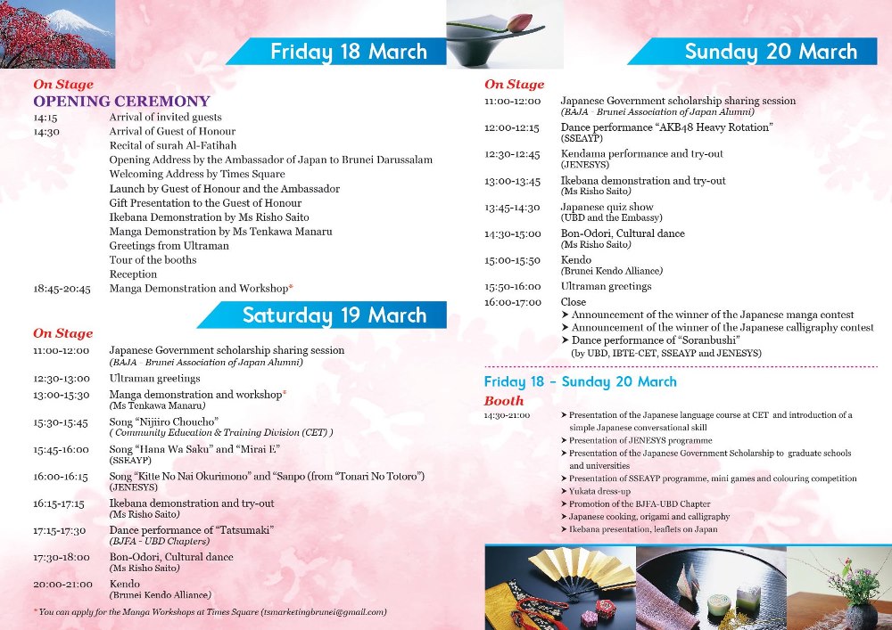 The event will introduce Japanese traditional culture, modern pop-culture, as well as information on studying in Japan, the youth exchange programme supported by the Government of Japan and other tourism information. The event not only aims to strengthen Brunei and Japan’s relationship but also to promote the Japanese language and highlight opportunities for studying in Japan. At the event, there will be live demonstrations and exhibition booths for Manga (cartoons), Ikebana (traditional Japanese flower arrangement), Japanese cooking, calligraphy, origami (paper folding), Yukata (casual Japanese summer kimonos) dressing-up, Japanese martial arts, songs and dances, quiz shows and many more.