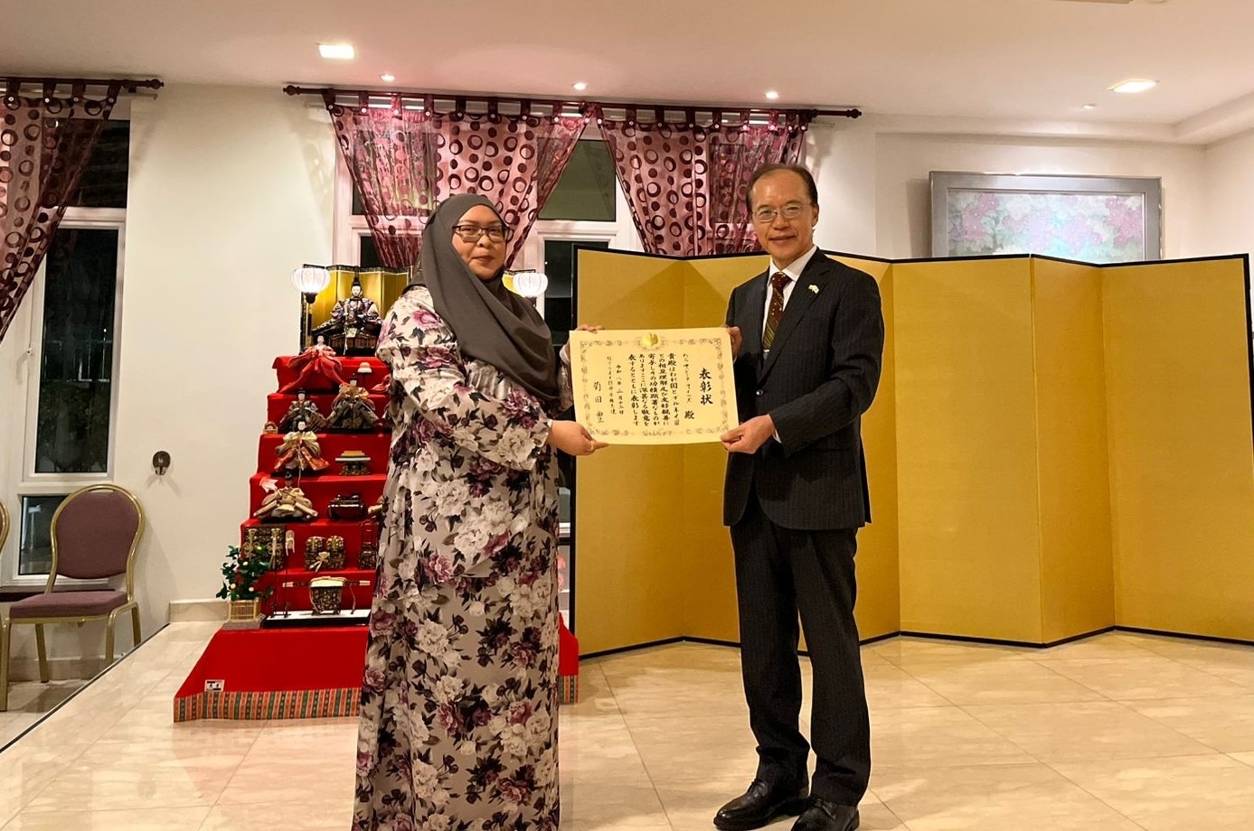 On 13th February, Ambassador Kikuta held a ceremony to award Ambassador’s Commendation to Ms. Hajah Najmina Fairuz binti Haji Abd Latif, President of the Brunei Association of Japan Alumni (BAJA) in recognition of her contributions to promoting the friendship and educational exchanges between Japan and Brunei.