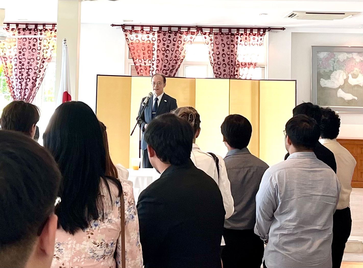 A total of 73 people took the JLPT 2025 across a range of language levels, from N1 to N5, of which 35 passed. During the ceremony, HE Ambassador Kikuta presented certificates to the successful examinees and congratulated them on their achievement. He also encouraged their continued quest for Japanese language further, citing the words for example to represent Japanese people’s never-give-up spirit “Fall seven times, stand up eight”.