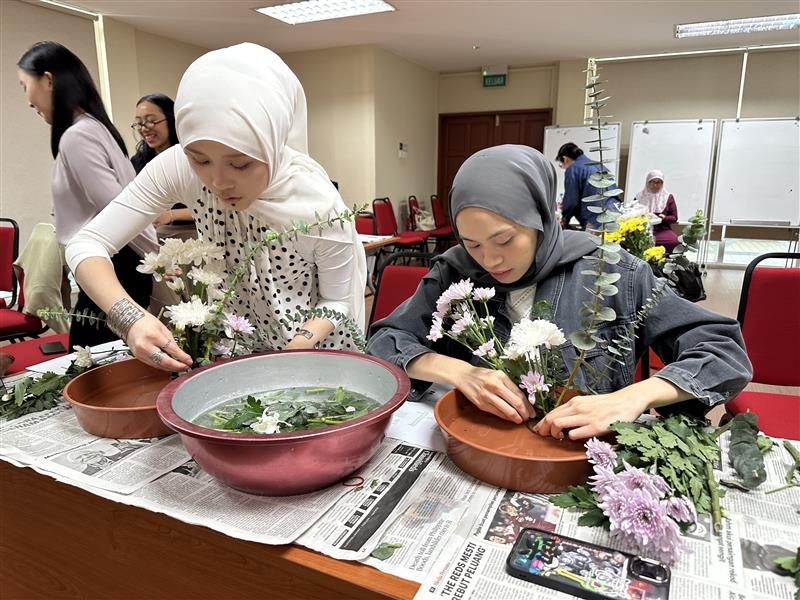 The Ikebana (Japanese flower arrangement) workshop was conducted by Ms TANIGUCHI Chieko, an experienced Ikebana instructor from the Sogetsu School of Japan, who introduced local participants to the principles of Ikebana. A total of 40 participants took part in the workshop, gaining hands-on experience in creating their own arrangements while learning about how to select flowers and the basic forms of Ikebana. Ms Taniguchi also led a workshop at Ambassador’s residence for another group of Bruneian participants during her stay in Brunei.