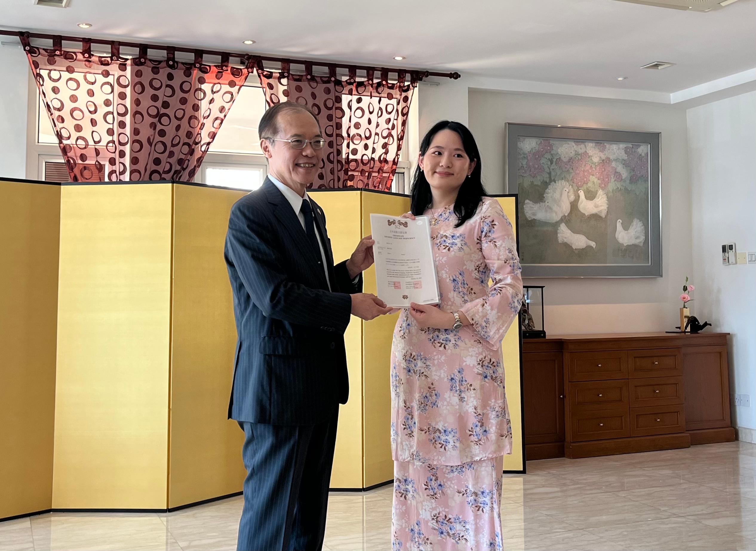 4月10日、大使公邸において、2025年度日本語能力試験合格者に対する認定書授与式が開催されました。ブルネイでは35名がN2~N5レベルに合格し、授与式に出席した合格者に対し、菊田大使から認定書が授与されました。また、菊田大使は授与式の冒頭挨拶中で、七転び八起きの精神で日本語を学び続けてほしいと激励しました。授与式には、チン・ウェイ・ケ教育省副次官、ブルネイ大学及び中等教育機関の日本語教師、さらにブルネイ日本元日本留学生総会の役員メンバー等が出席しました。2026年の日本語能力試験は、12月6日(日)に実施される予定です。